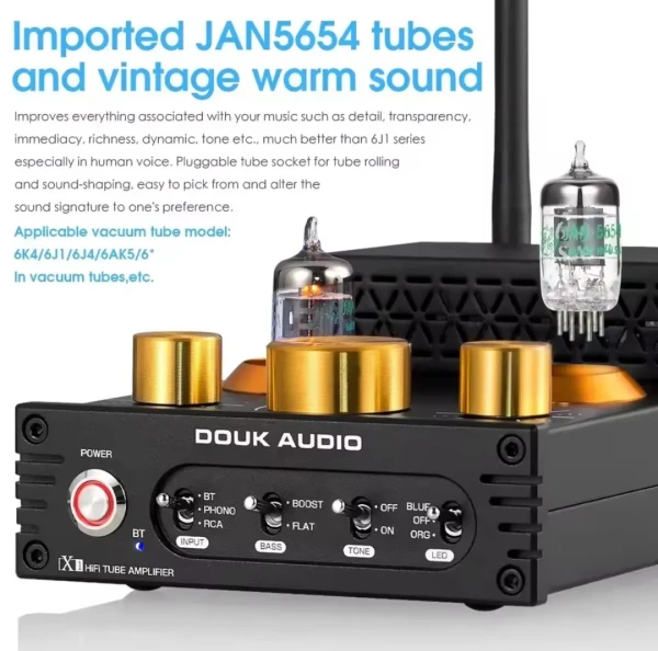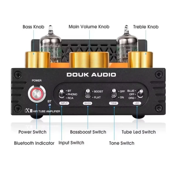Douk Audio X1 tube power amplifier is the fully upgraded version in all aspects, using JAN5725 vacuum tubes to improve the sound quality, TDA7498E amp IC that can max output 160W+160W to drive all home speakers, integrating the function of phono preamp and amplifier to support MM phono turntables input, and adding a low frequency output that can connect an active subwoofer to build 2.1 channel audio system.