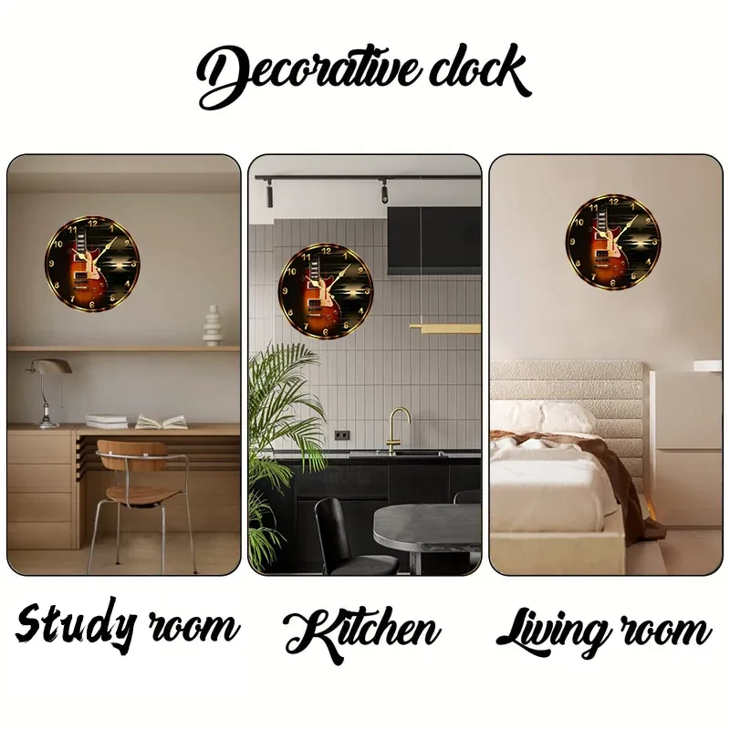 Electric guitar themed wooden wall clock looks great in your living room, bedroom, den, rec room, basement, music room, etc. Silent, makes no noise.