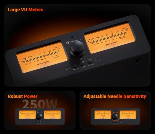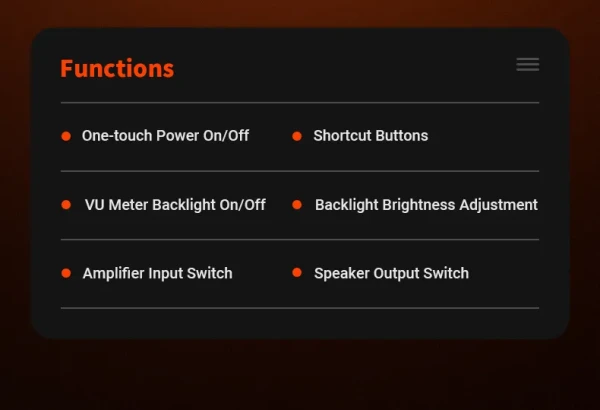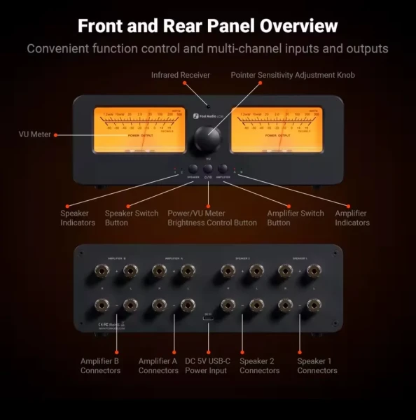 Ease of Use: Offers both button and remote control operation, enabling one-tap switching between two different amplifiers and two different sets of speakers (4 Speakers total). It streamlines the process of A/B comparison testing for two amplifiers or speakers, ensuring straight forward accessibility. Moreover, adjusting the backlight brightness and needle sensitivity is made effortlessly simple, enhancing the overall user experience.
