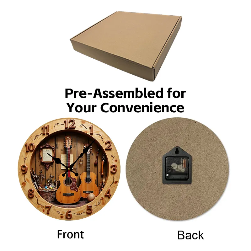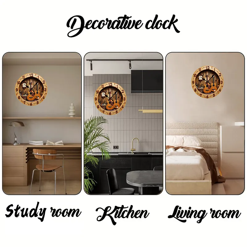 Beautiful 2D Wooden wall clock contains 2 Guitars and other objects. Looks great in any living room, bedroom, den, kitchen, rec room, etc.