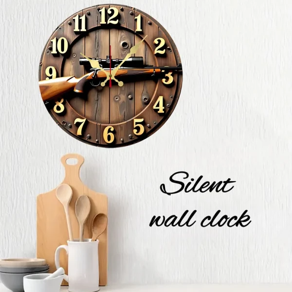 Winchester Rifle on a simulated wooden background wall clock looks great in your home, den, bedroom, living room, garage, workshop, rec room, mancave, basement, etc.