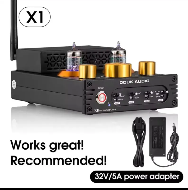Douk Audio X1 tube power amplifier is the fully upgraded version in all aspects, using JAN5725 vacuum tubes to improve the sound quality, TDA7498E amp IC that can max output 160W+160W to drive all home speakers, integrating the function of phono preamp and amplifier to support MM phono turntables input, and adding a low frequency output that can connect an active subwoofer to build 2.1 channel audio system.