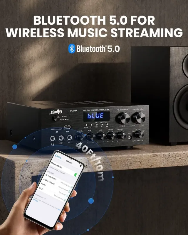 Bluetooth 5.0 FM Stereo Karaoke Amplifier with USB/SD/Aux inputs.