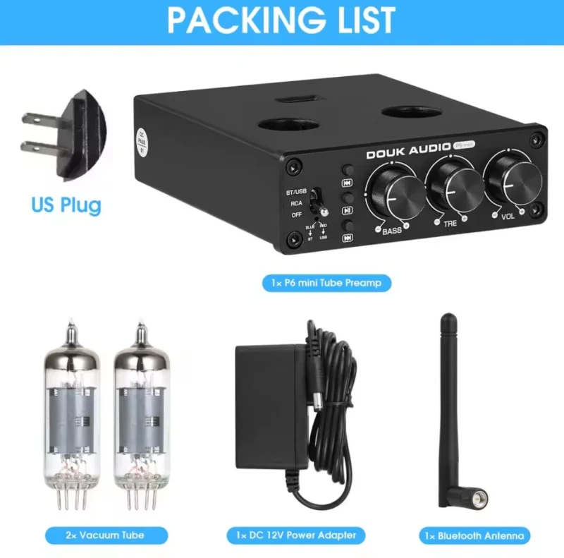 Douk Audio Stereo Tube Preamplifier Stereo w/Bass & Treble Controls, Bluetooth 5.0, USB Disk Input