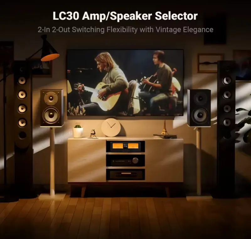 *Vintage Elegance: The LC30 boasts dual large VU/Wattmeters, complete with adjustable brightness across five levels. It offers versatile connectivity with two inputs and two outputs, enabling four distinct configurations. Beyond its functional prowess as a switcher, it stands as exquisite decorative VU meters allowing you to enjoy the vibrant audio-visual feast.
