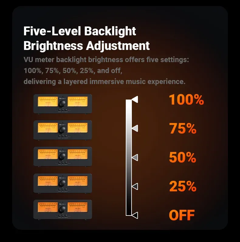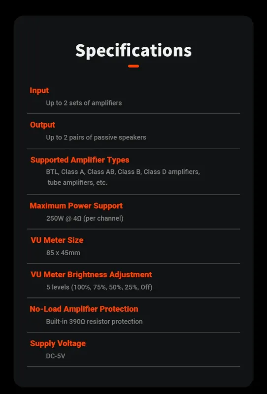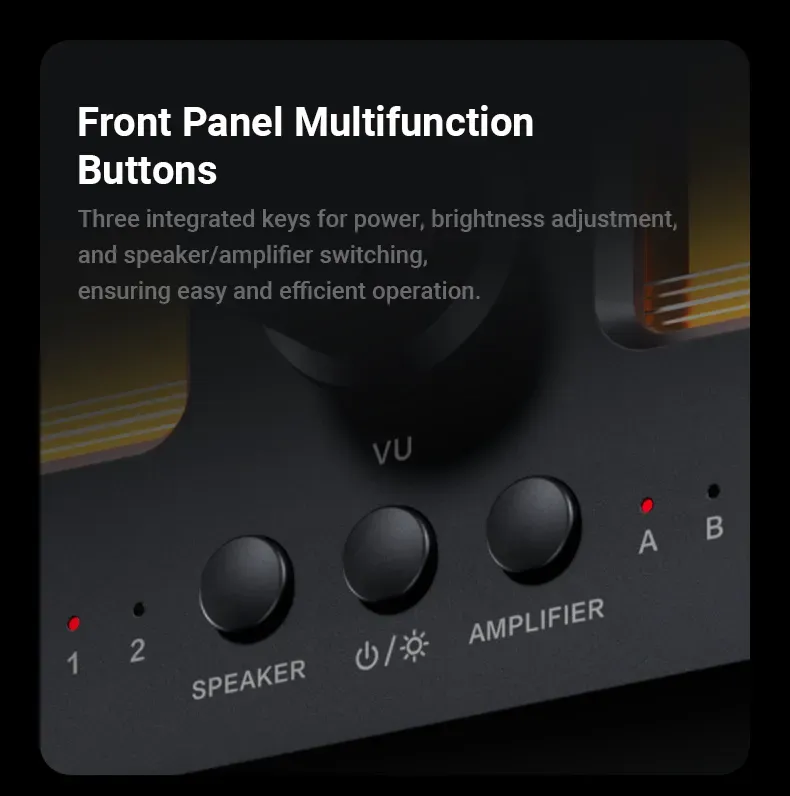 Ease of Use: Offers both button and remote control operation, enabling one-tap switching between two different amplifiers and two different sets of speakers (4 Speakers total). It streamlines the process of A/B comparison testing for two amplifiers or speakers, ensuring straight forward accessibility. Moreover, adjusting the backlight brightness and needle sensitivity is made effortlessly simple, enhancing the overall user experience.