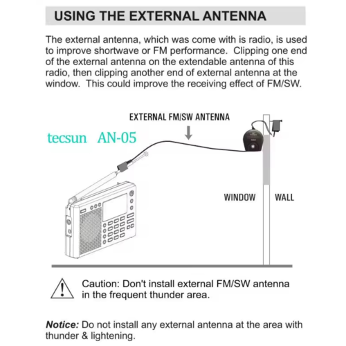 4. Quick and easy to setup: connect the adaptor of the AN-80 antenna to the lower end of the telescopic whip antenna on the radio, hang up the other end of the AN80 antenna to the window or anywhere higher. (It can connect to the antenna jack and telescopic antenna).